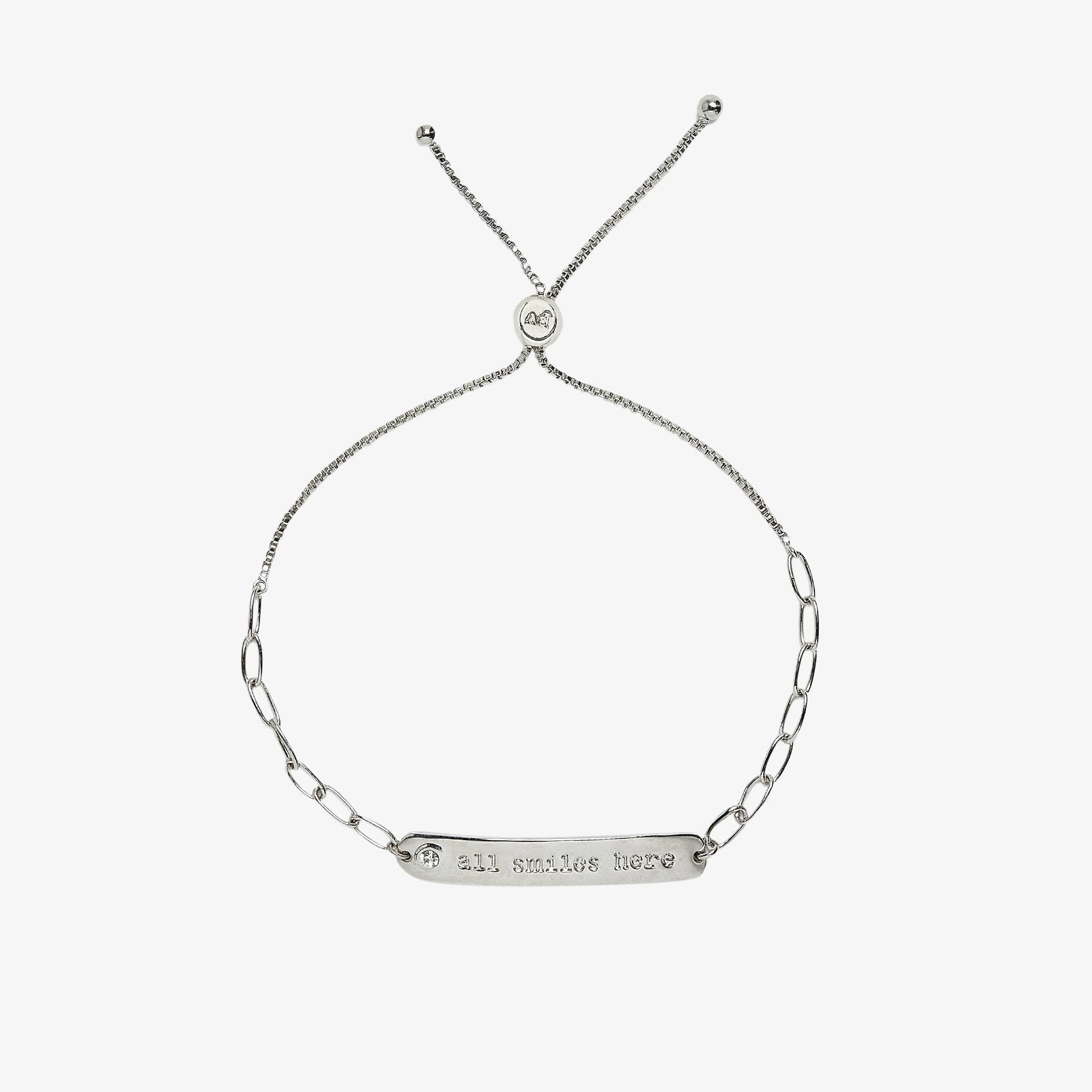 No bad days with this bracelet! This silver box chain bracelet is a show-stopper with an easy fit, adjustable slider clasp and a single sparkling stone. Engraved with Charli's signature phrase "all smiles here", this style is the perfect pick-me-up!