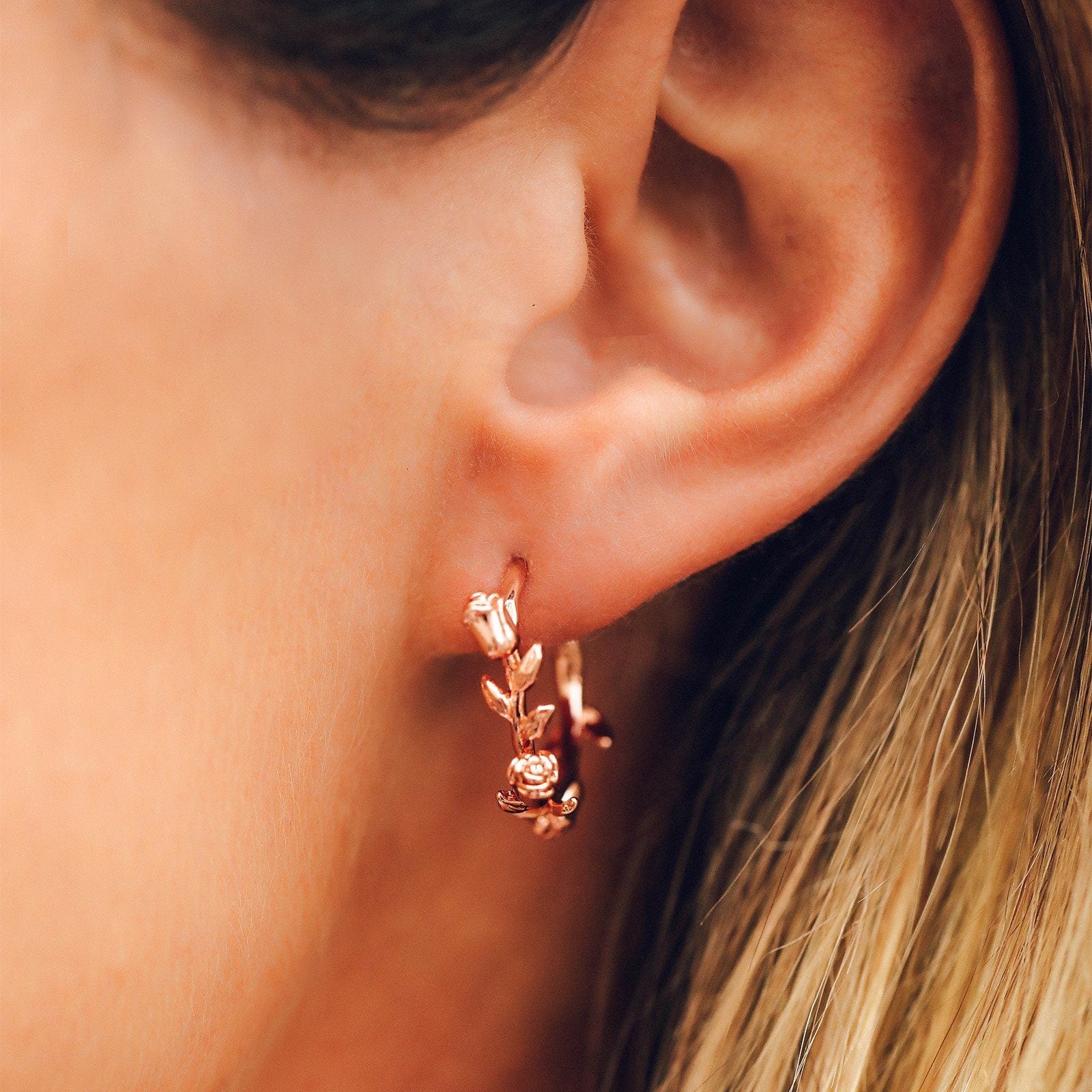 Romanticize your life with our new Disney Belle Rose Hoop Earrings! These elegant rose gold earrings feature a gorgeous detailed rose design with an organically textured finish. It's like Valentine's day, everyday!