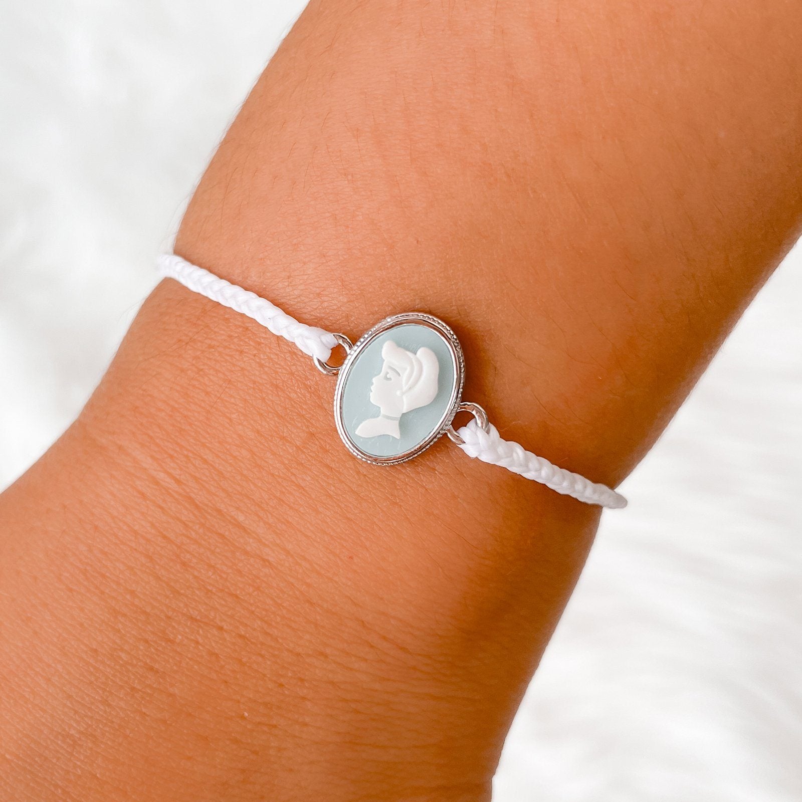 Who needs Disney's Prince Charming when you can have the Disney Cinderella Cameo Charm Bracelet? Featuring a silver and delicate blue Cinderella cameo charm on a white bitty braid, this bracelet has all the romance you need!