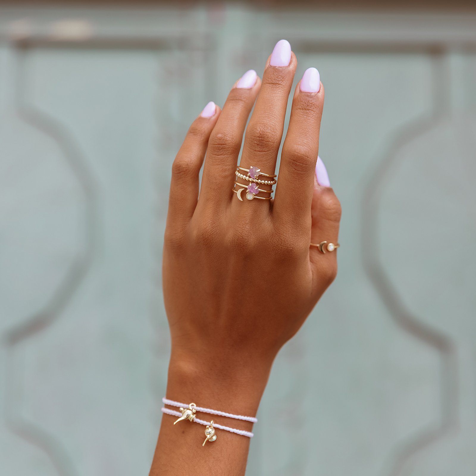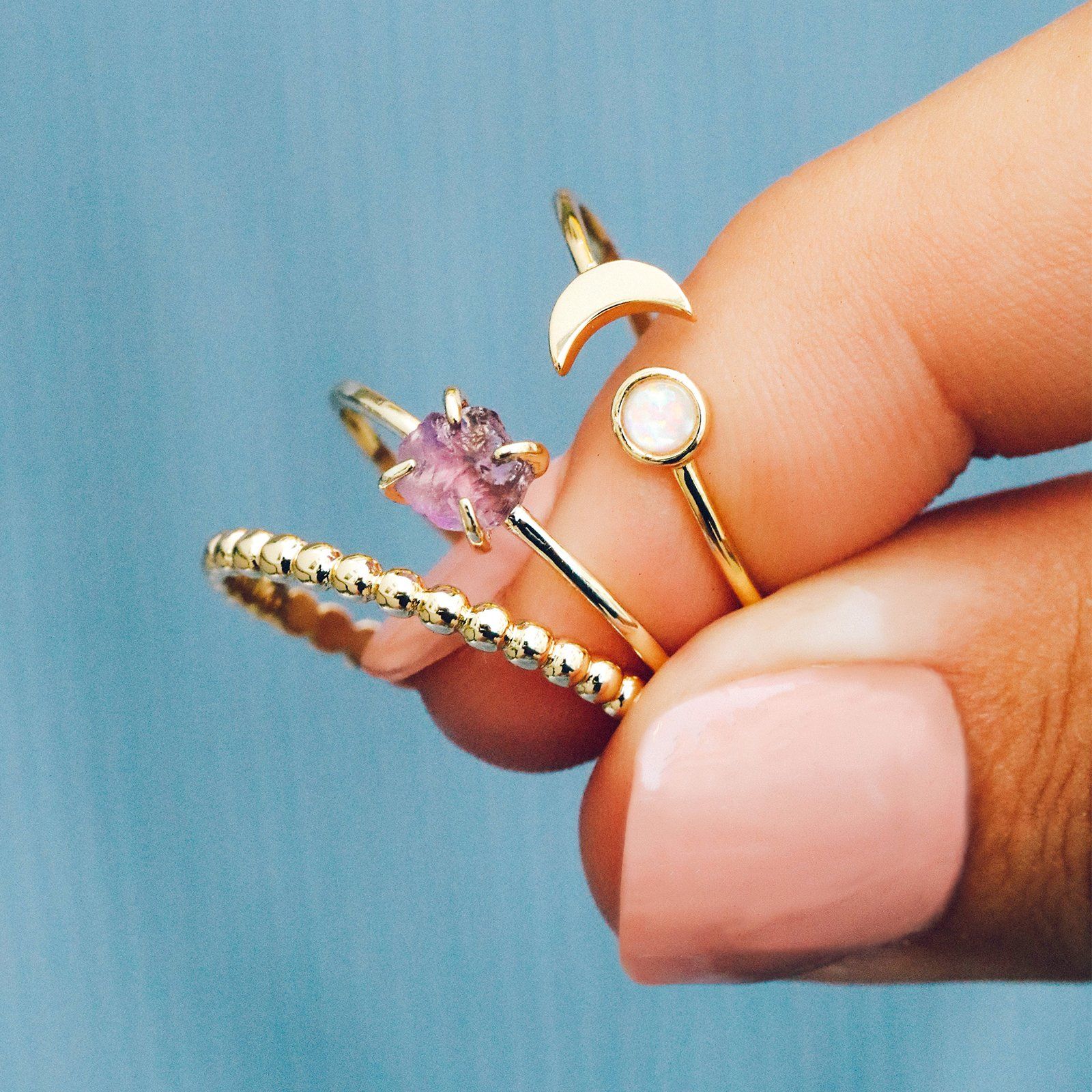 Let us share this Disney *Jasmine Ring Stack* with yooOoOu! But seriously - we're shouting from the roof tops that everyone needs this dainty three ring stack featuring an open moon and opal ring, a simple raw amethyst ring and a ball bead ring! You can wear this set stacked on one finger or you can mix and match with other PV rings too!
