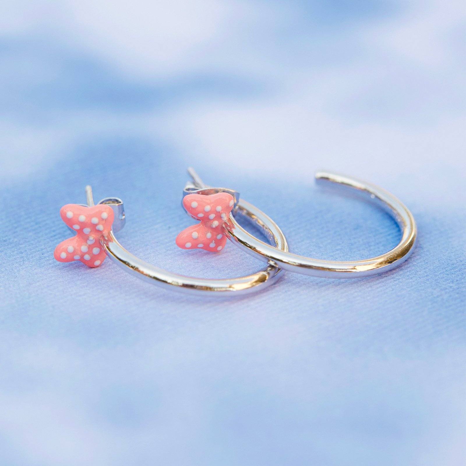 The rumors are true, we combined our fan fave Hoop Earring with the timeless Disney Minnie Mouse bow! The Minnie Bow Hoop Earrings come in silver and feature Minnie Mouse's super iconic and mega cute pink (and polka dotted) bow attached at the base of the hoop for a unique look!