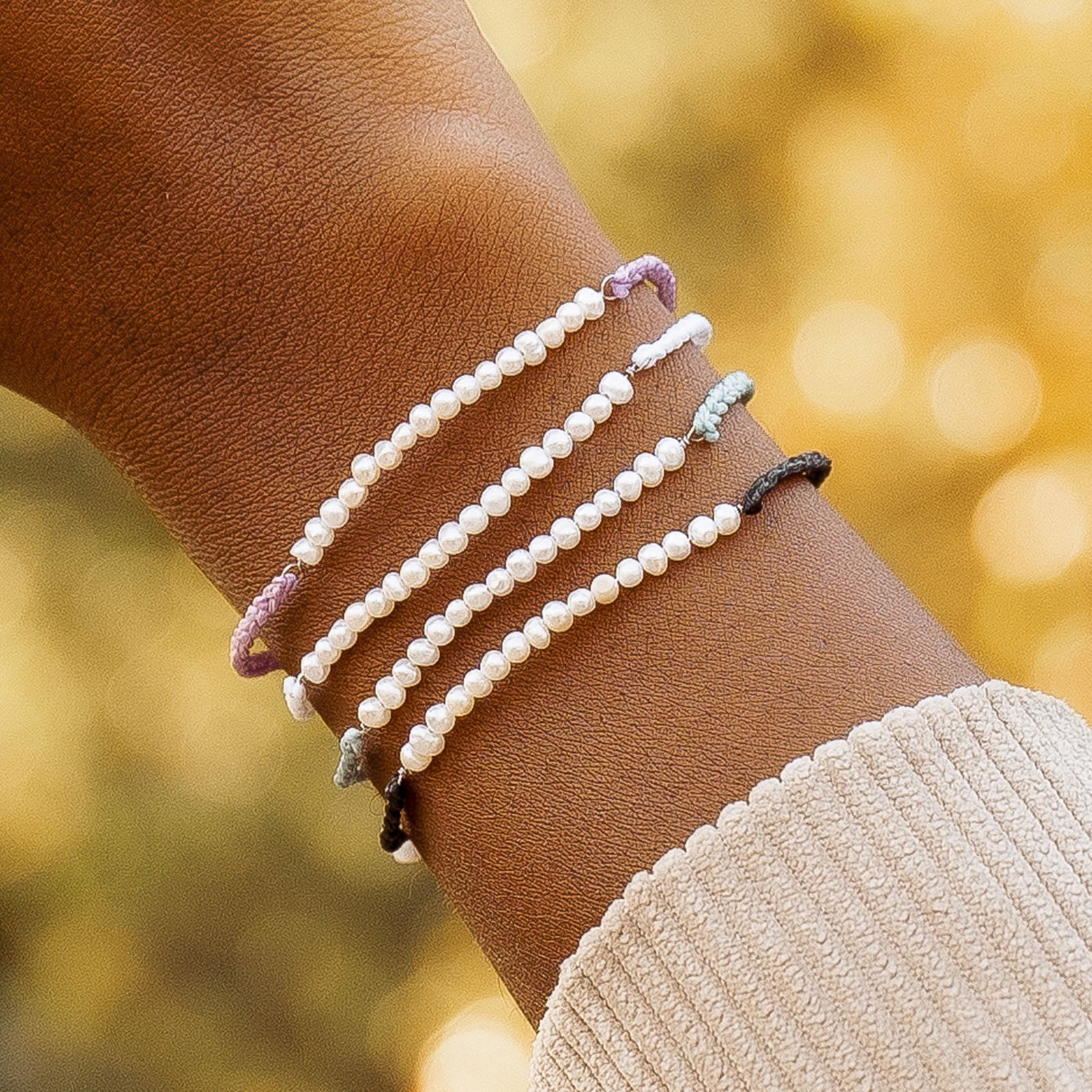 Class up your everyday outfit with our new Freshwater Pearl Bracelet. This bitty braid design comes in three string shades, with a strand of dainty freshwater pearls that are oh so chic. Each pearl is 100% genuine, meaning no two look alike and every bracelet is unique!
