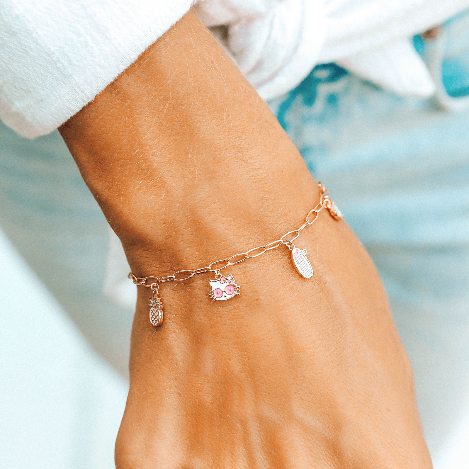 You'll be the coolest in our Hello Kitty Charms Chain Bracelet. This rose gold design features a paperclip-chain band, with an array of dangling enamel charms inspired by the global icon herself. For each Sanrio style sold on our website, Pura Vida will donate 5% of the purchase price* to Kindness.org, a nonprofit organization dedicated to building a kinder world.