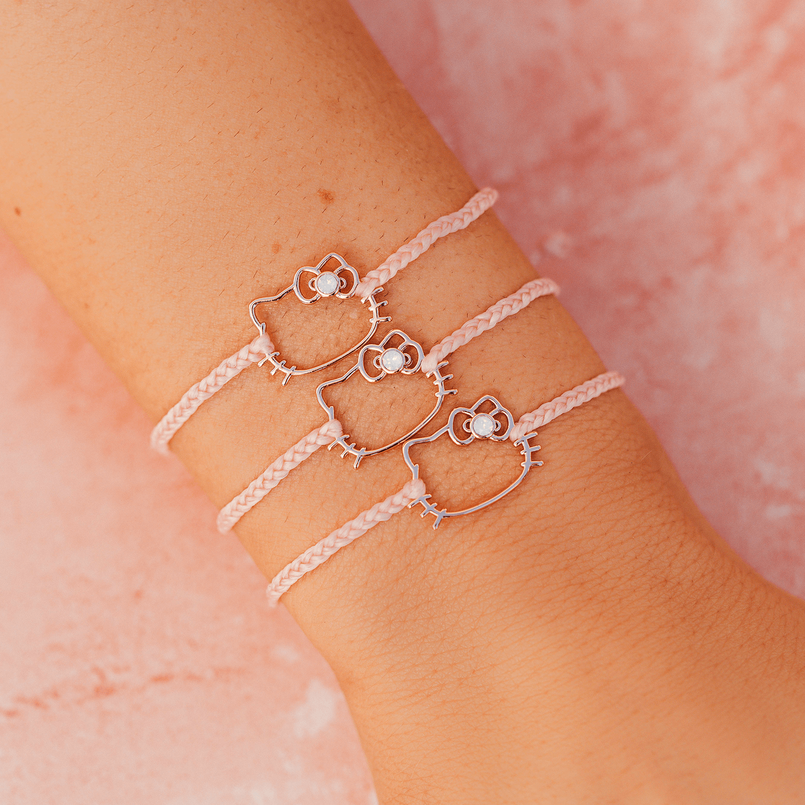 Look stunning in our Hello Kitty Delicate Opal Charm Bracelet. Set on a baby pink bitty braid band, this cute style features a cutout Hello Kitty charm, with a Swarovski white opal accent for a bit of extra shimmer. For each Sanrio style sold on our website, Pura Vida will donate 5% of the purchase price* to Kindness.org, a nonprofit organization dedicated to building a kinder world.