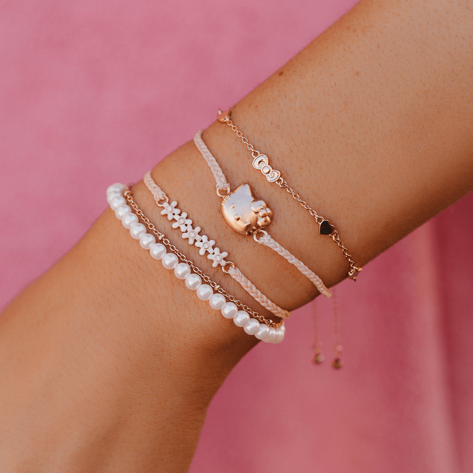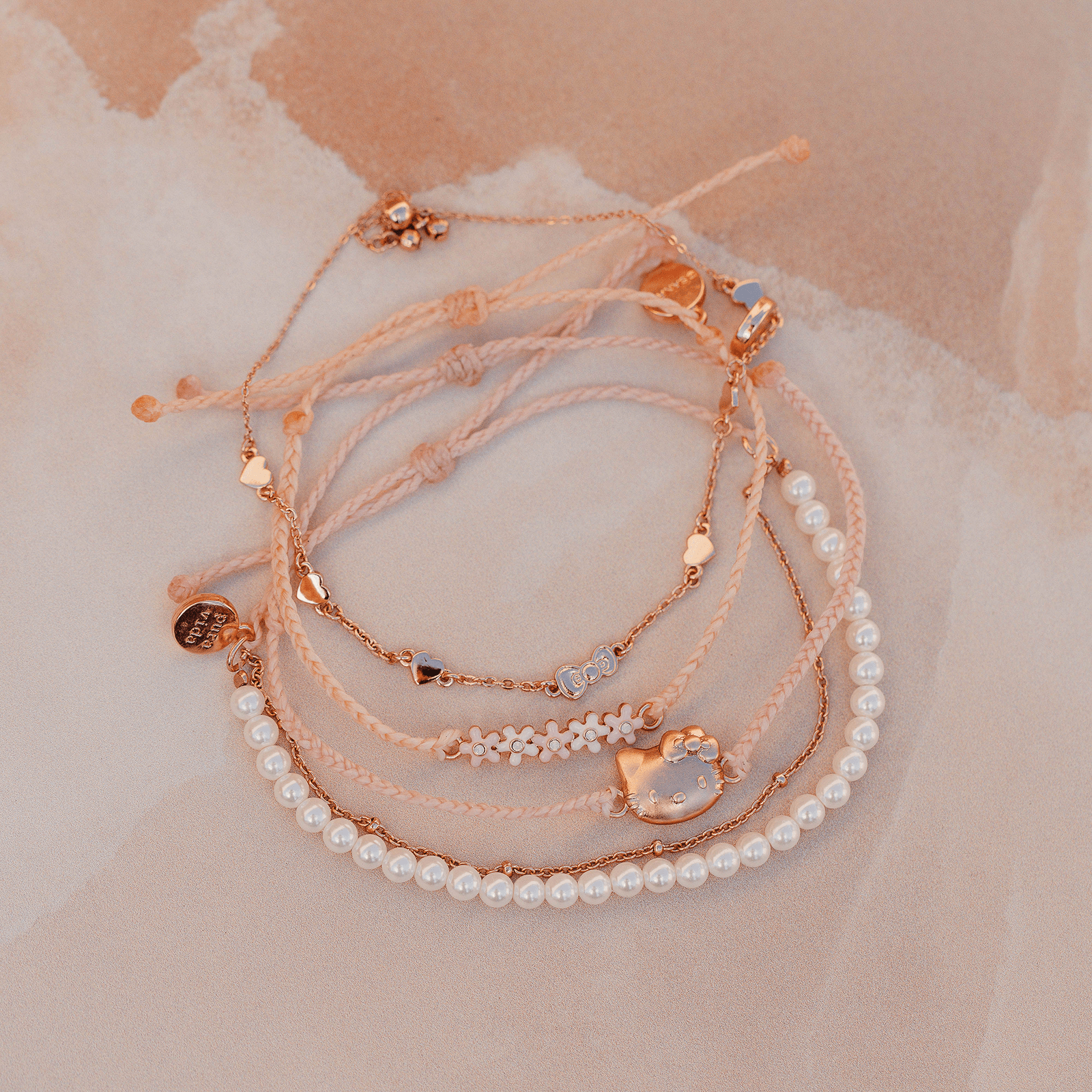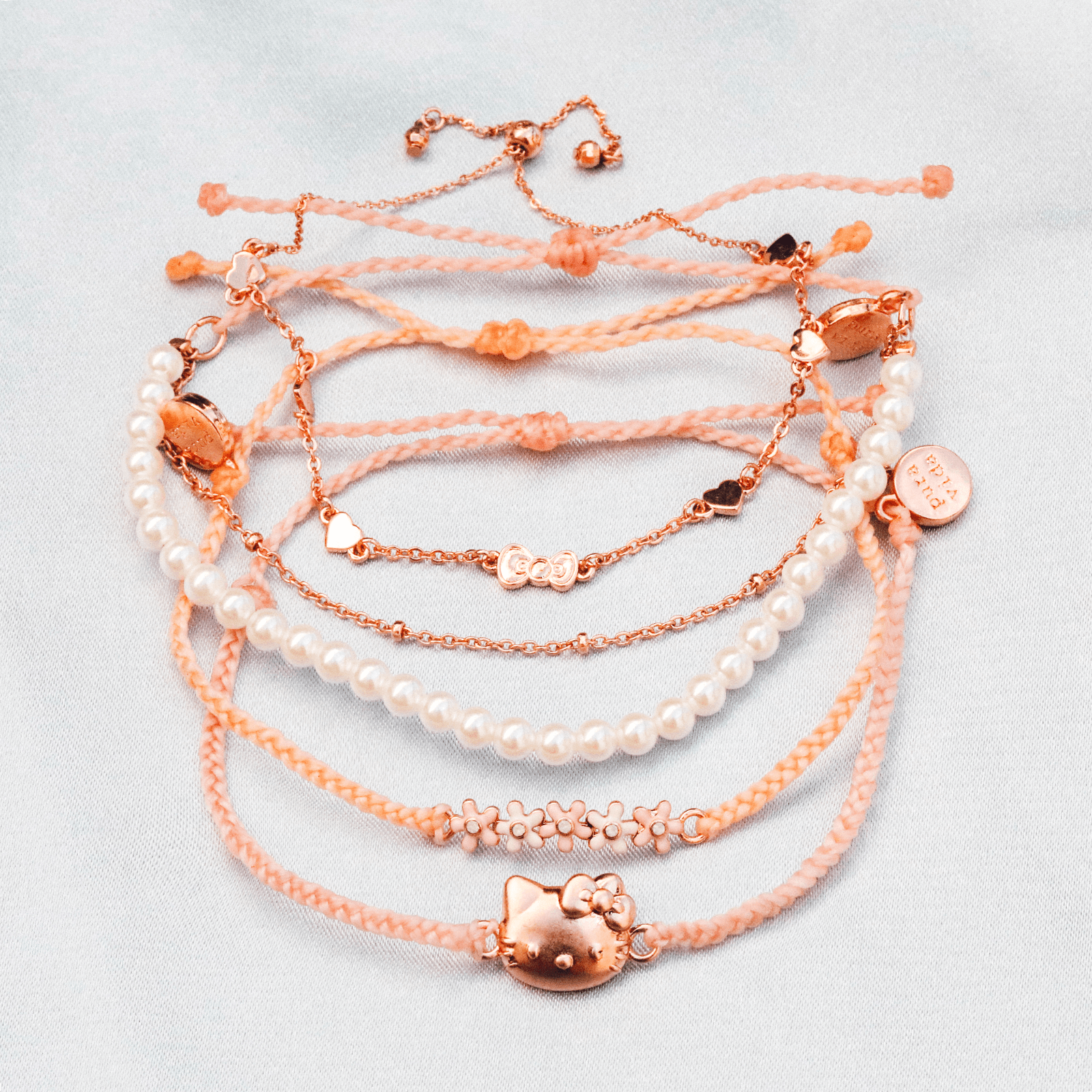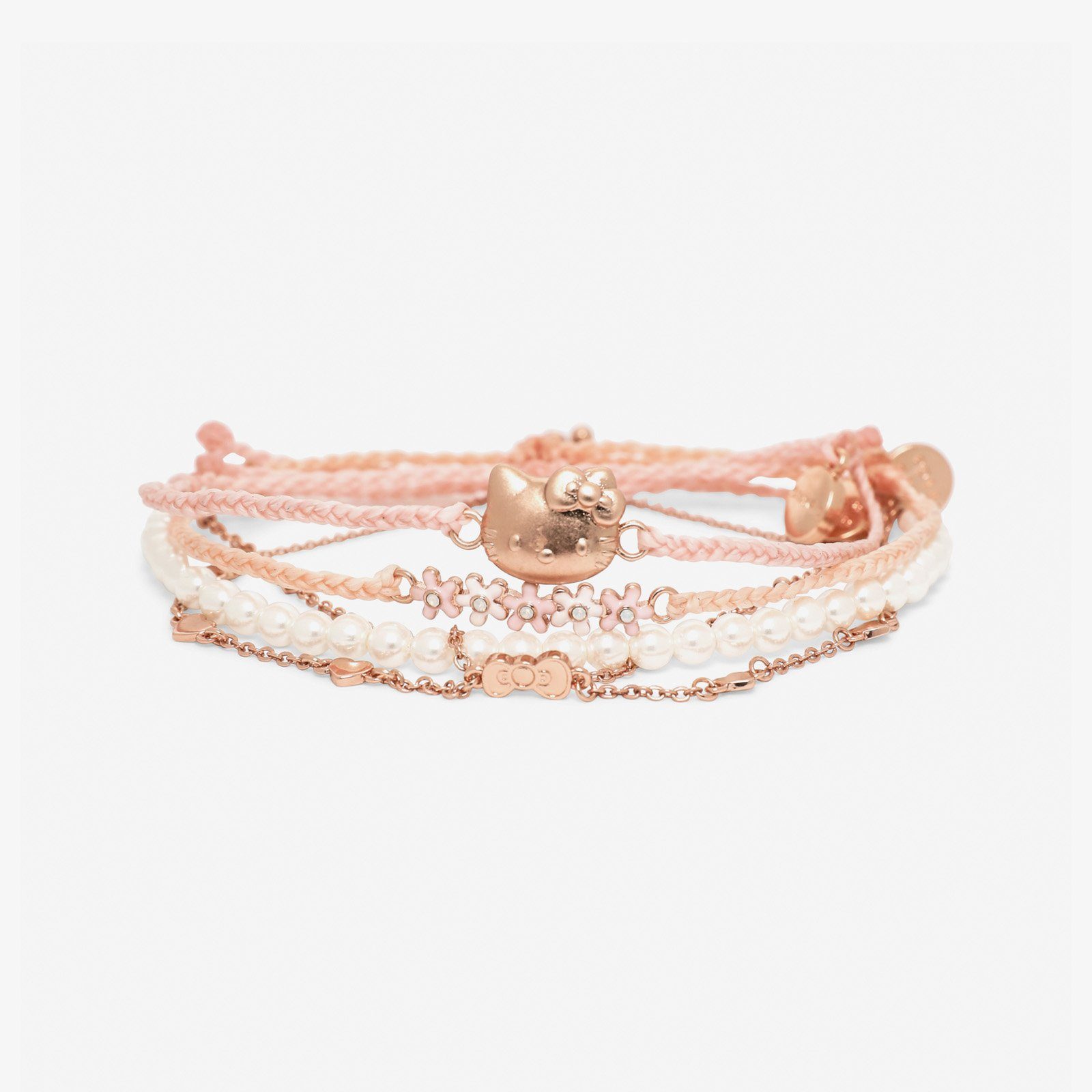 Looking for the perfect pack? Our Hello Kitty Style Pack is the one for you! Featuring four stackable or standalone styles, this set includes a bitty braid design with a rose gold Hello Kitty charm; a pearl and chain bracelet; an enamel flower charm style; and a metal bow and heart charm design. For each Sanrio style sold on our website, Pura Vida will donate 5% of the purchase price* to Kindness.org, a nonprofit organization dedicated to building a kinder world.