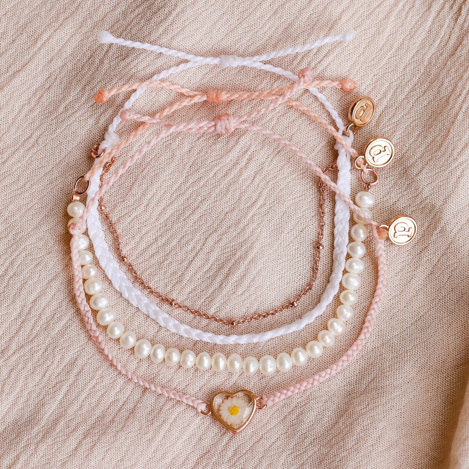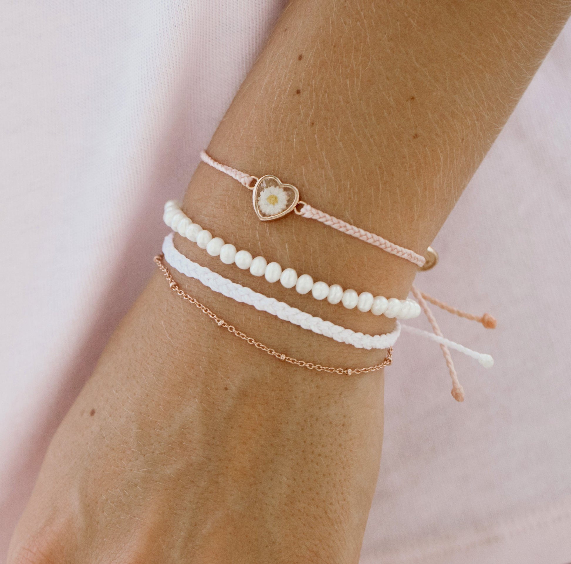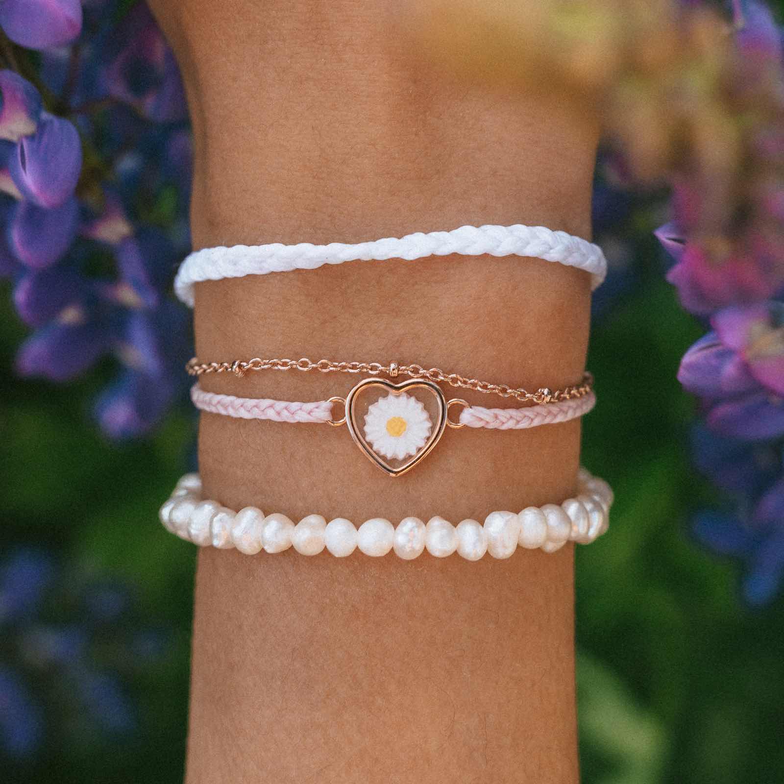 It's sweet, it's dainty, it's our new Keep Blooming Pack! This 3 pack comes in baby pinks and rose gold featuring a dried daisy charm, itty bitty pearls and a mini braided bracelet plus a delicate chain! Pair this with our Bitty Pearl Chain Anklet for a complete look!