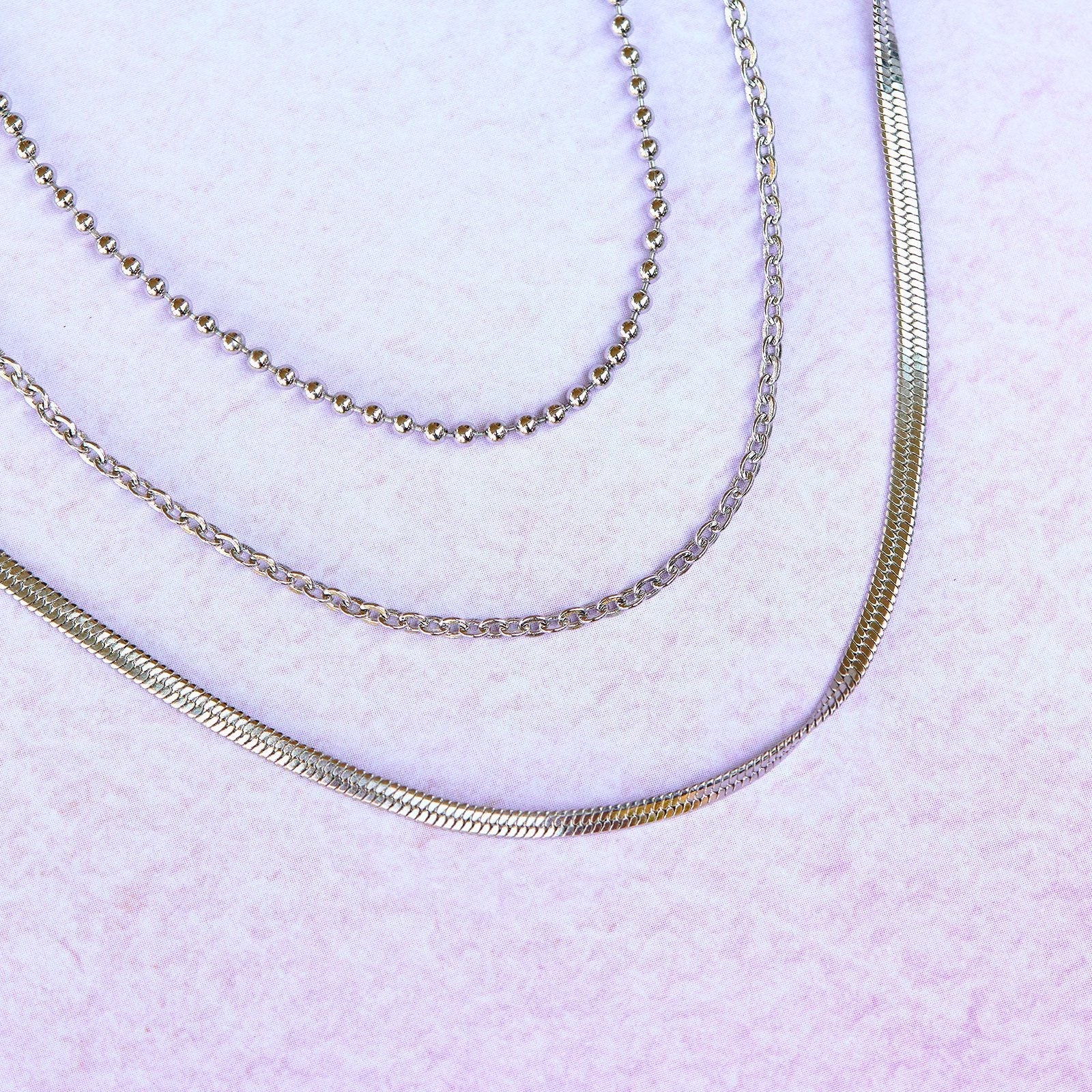 Pile on the pretty with our Layered Chain Choker. Available in two metal finishes—silver and rose gold—this trio of styles features a ball chain design, mini chain necklace and round snake chain for a statement style.