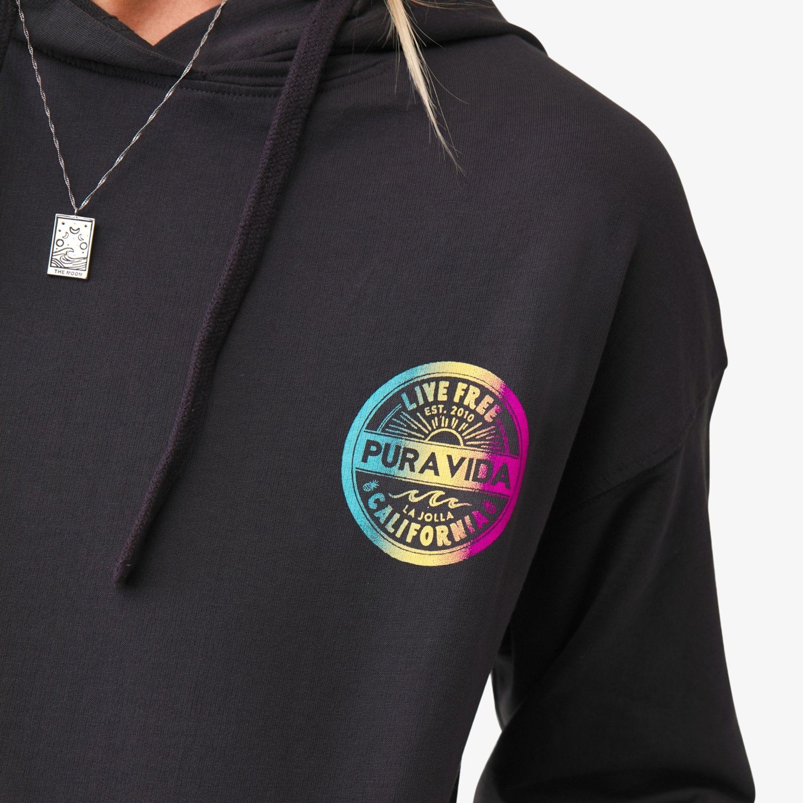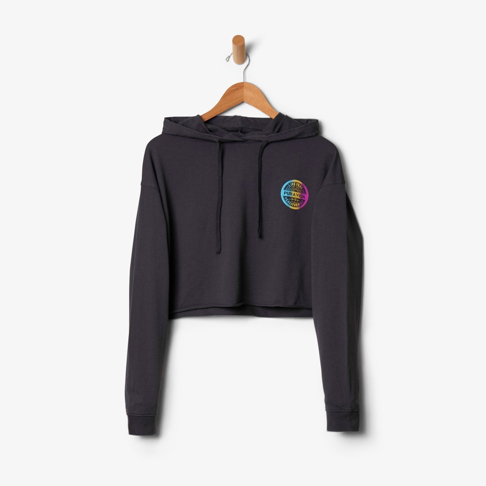 Our Live Free Crop Hoodie is what Pura Vida’s all about: Embracing a laid-back lifestyle (all while looking amazing!). The cropped design comes in a bold black hue, with rainbow medallion graphics that’ll give you total Cali vibes.
