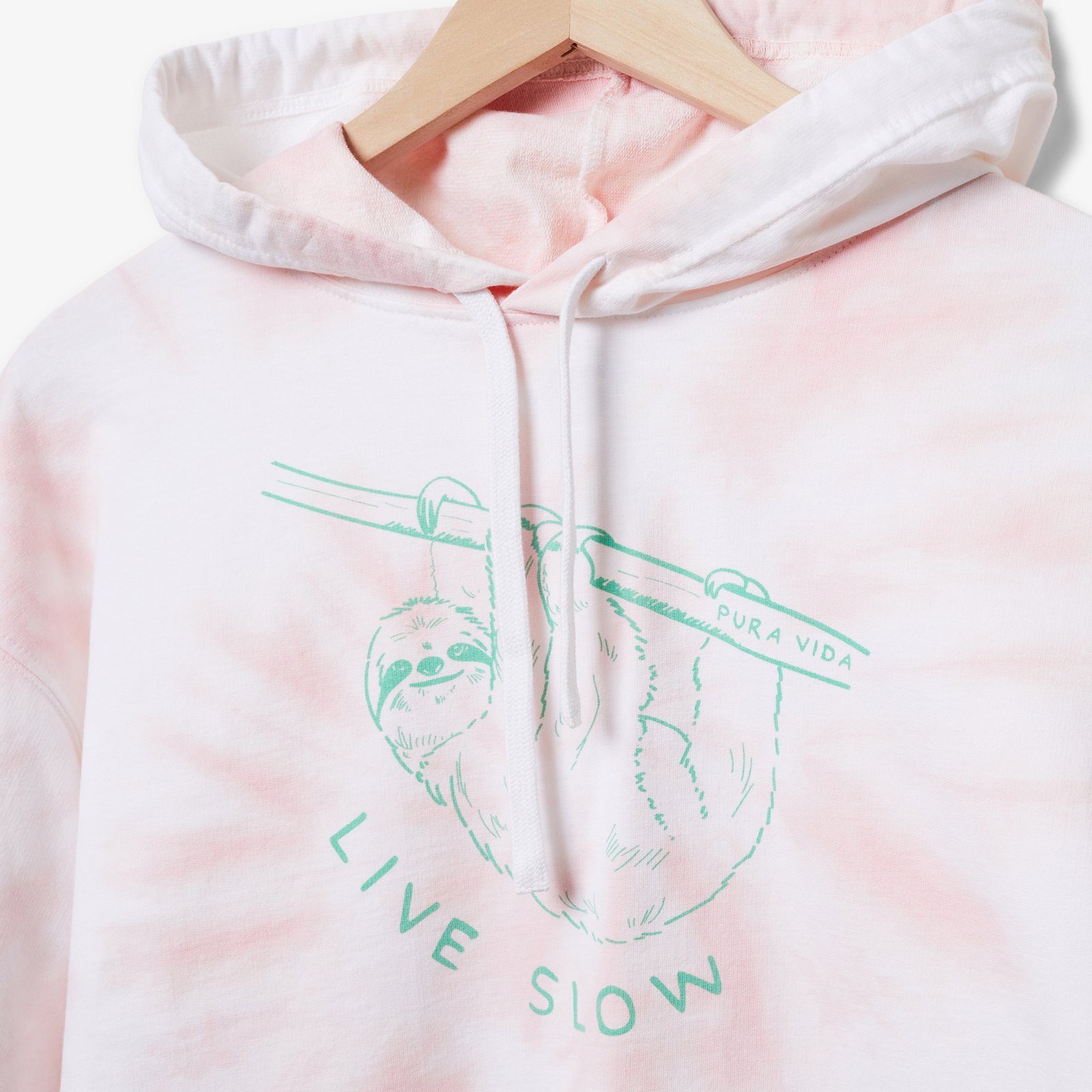 Slow down and smell the roses with our Live Slow Crop Hoodie! This custom pink tie dye hoodie with an ever so slow sloth graphic saying “Live Slow” is the ultimate statement piece! After your first wash, the Live Slow Crop Hoodie shrinks in all the right places for a perfect fit!
