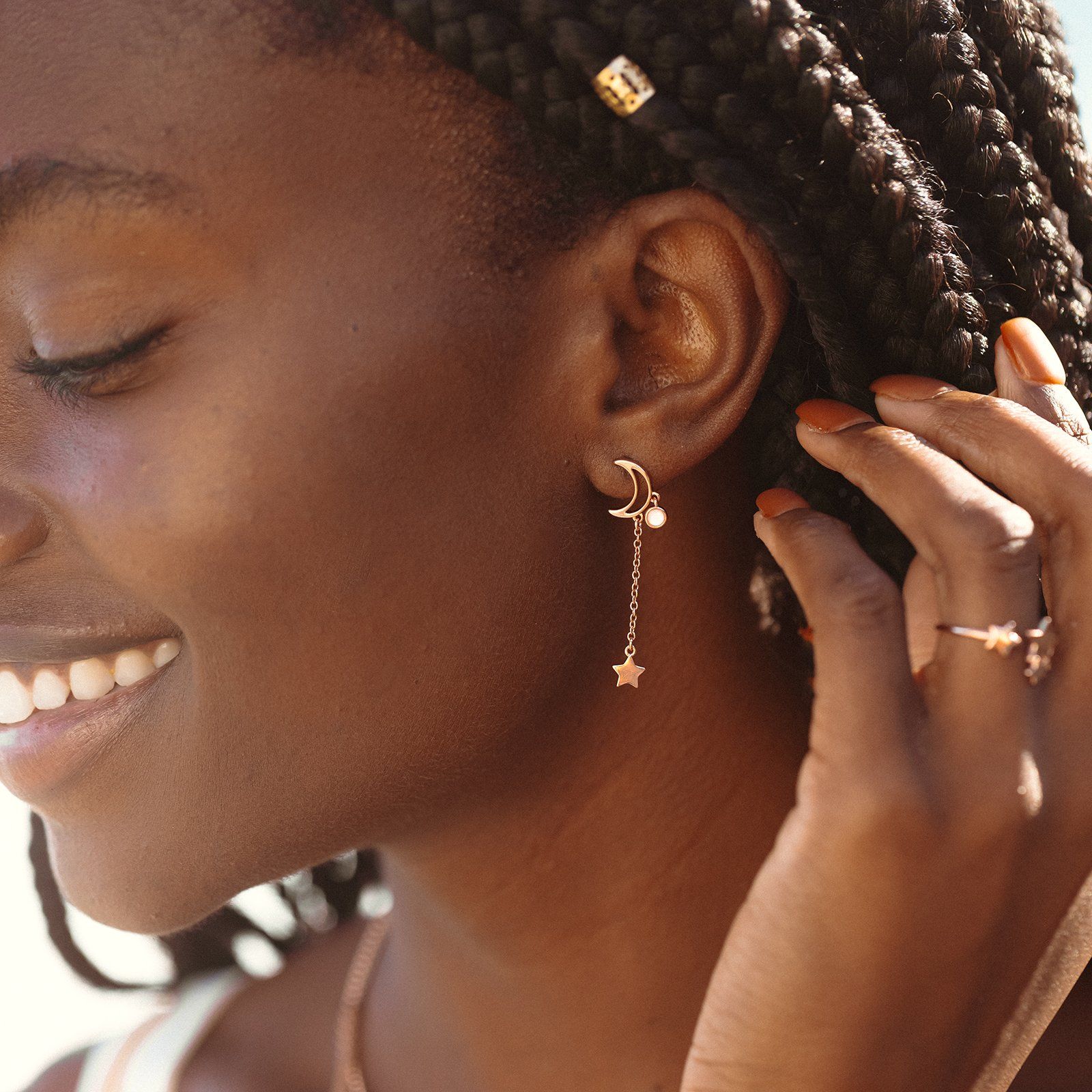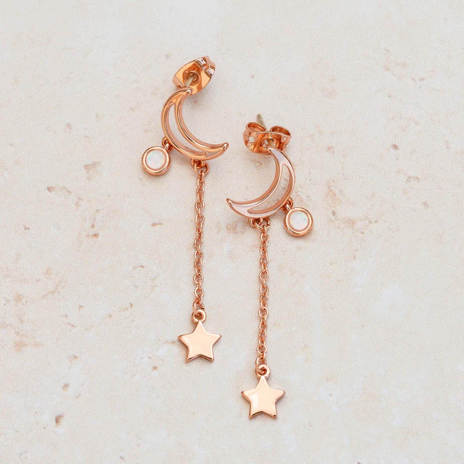 Get the ultimate celestial style with our Milky Way Drop Earrings. This gorgeous rose gold pair features a cutout moon stud, with a dangling chain-and-star accent and itty bitty opal charm. Cutest earrings in the galaxy? Yeah, we think so!