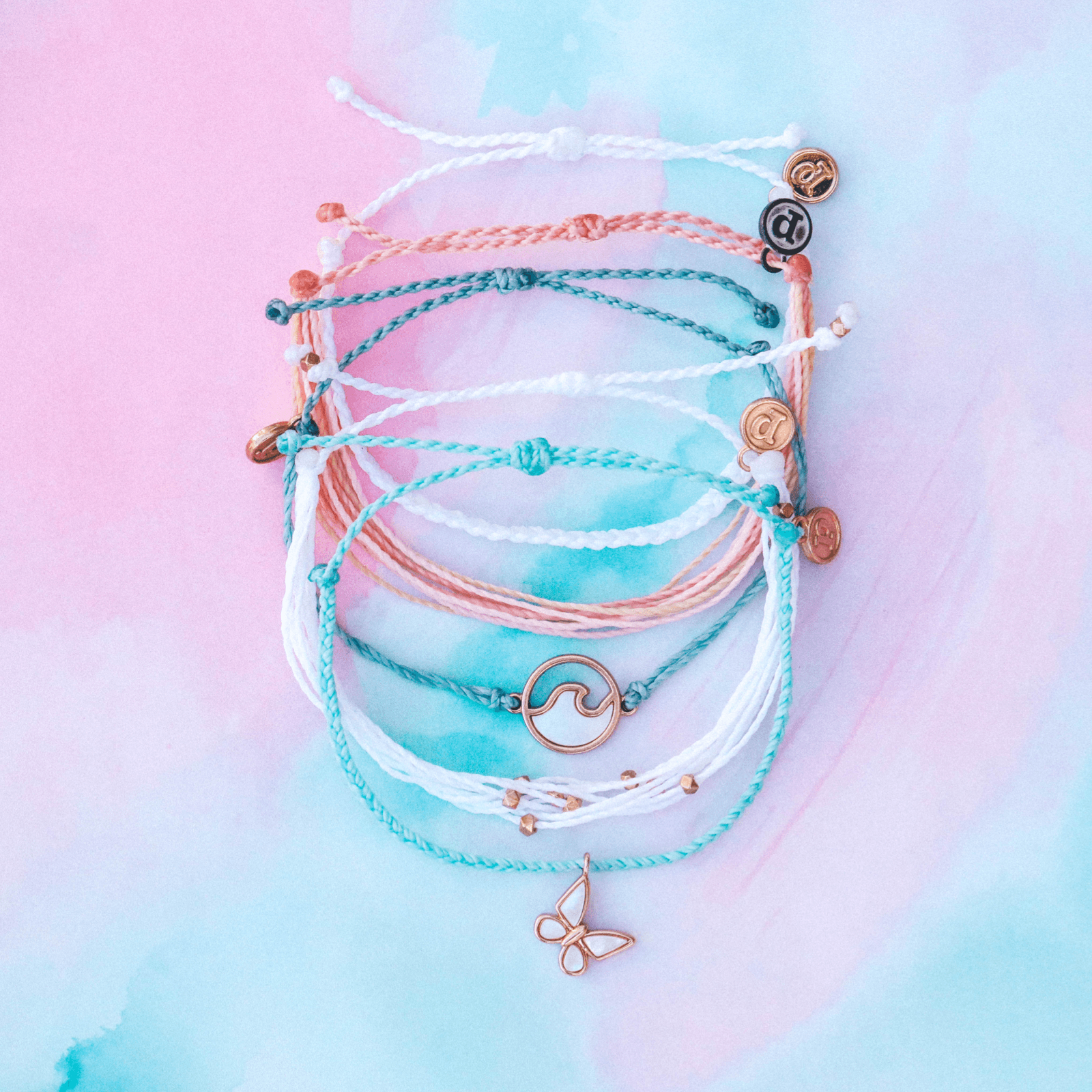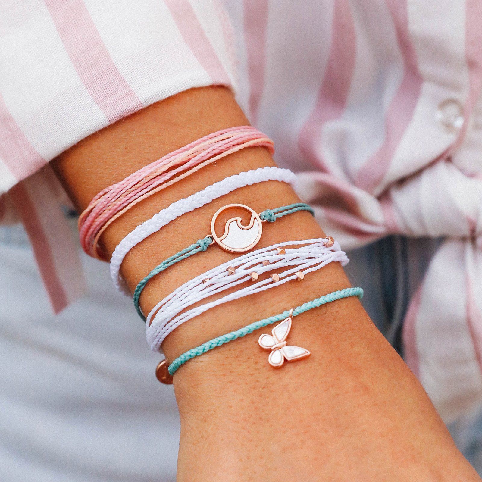 Searching for the perfect spring stack? Well, this is it! Our Monarch Grove Pack comes in pretty pastel shades and five must-have styles: a fresh white Malibu, a super-sweet Original, a simple friendship bracelet, a bitty braid design with a dangling butterfly charm, and a mother of pearl Wave Charm Bracelet.
