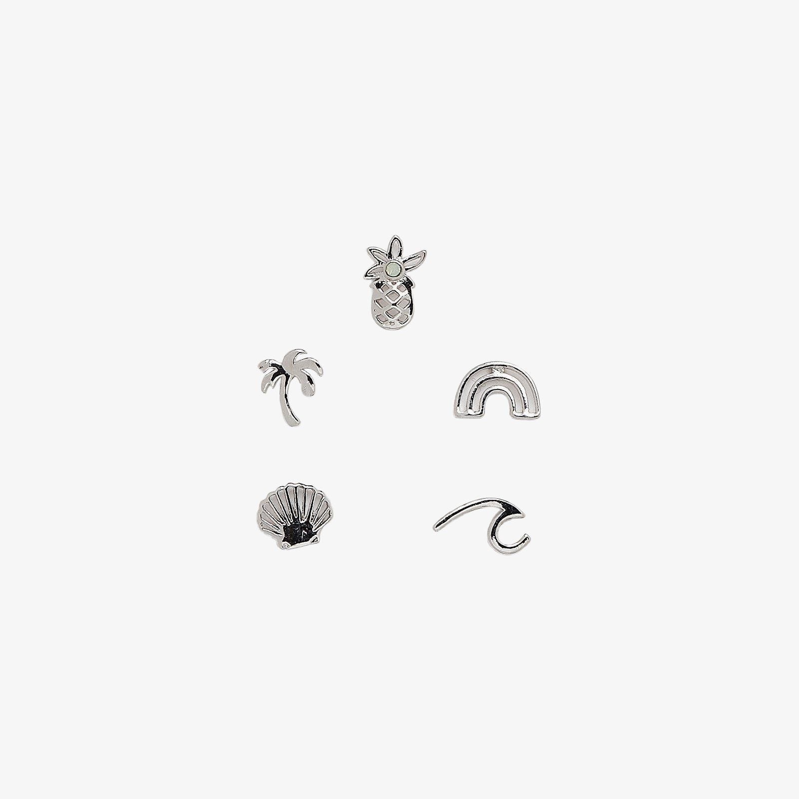Mix, match and make the most of your shore style with our Playa Stud Set! This five-piece set comes in a silver metal finish, with an array of pretty paradise-inspired designs, from a stone-studded pineapple and palm tree to a shell, rainbow and wave.