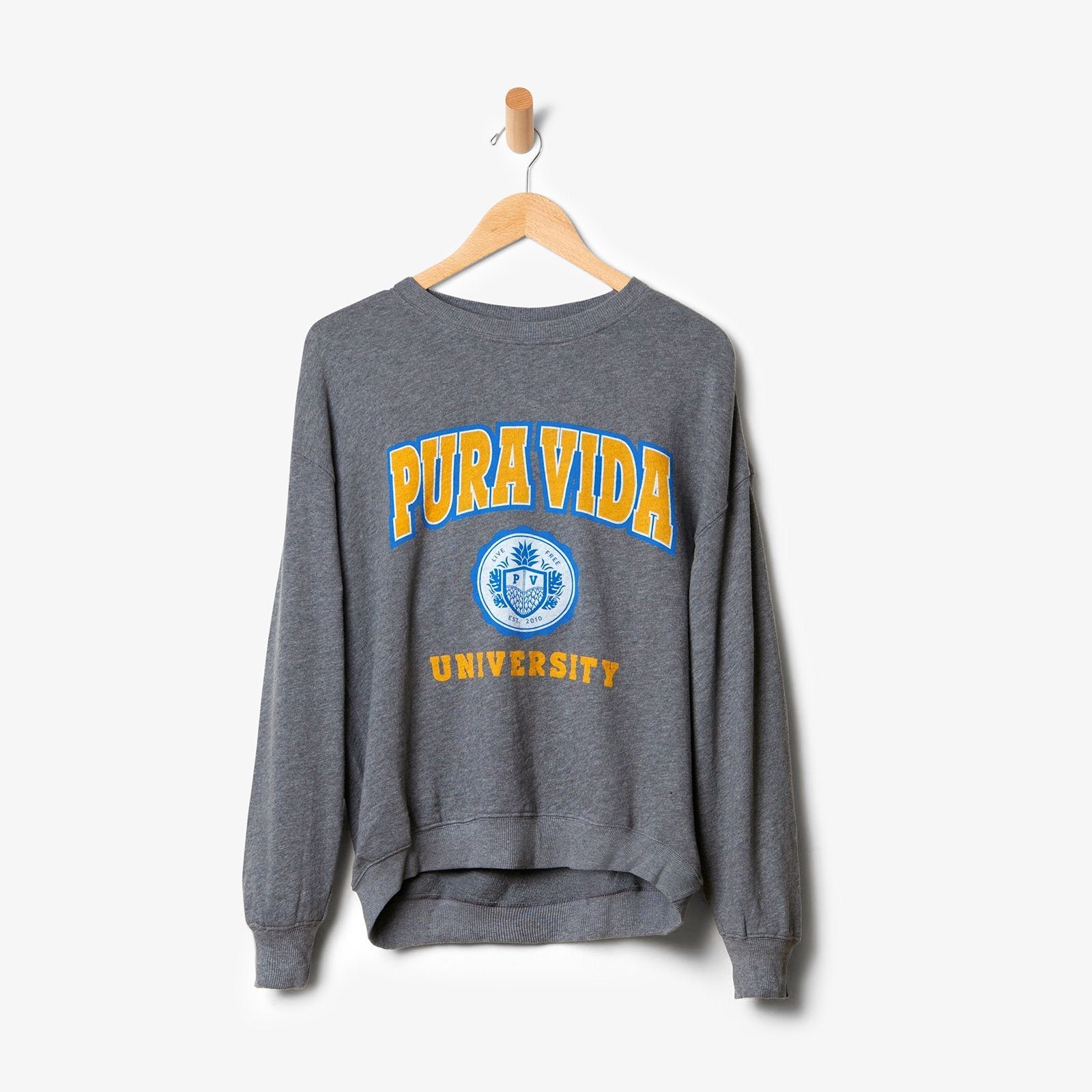 You’re sure to be top of the class in our PV University Oversized Crew Fleece! This heather grey design has a cool lived-in look, with a classic college sweatshirt feel and intricate Pura Vida logo.