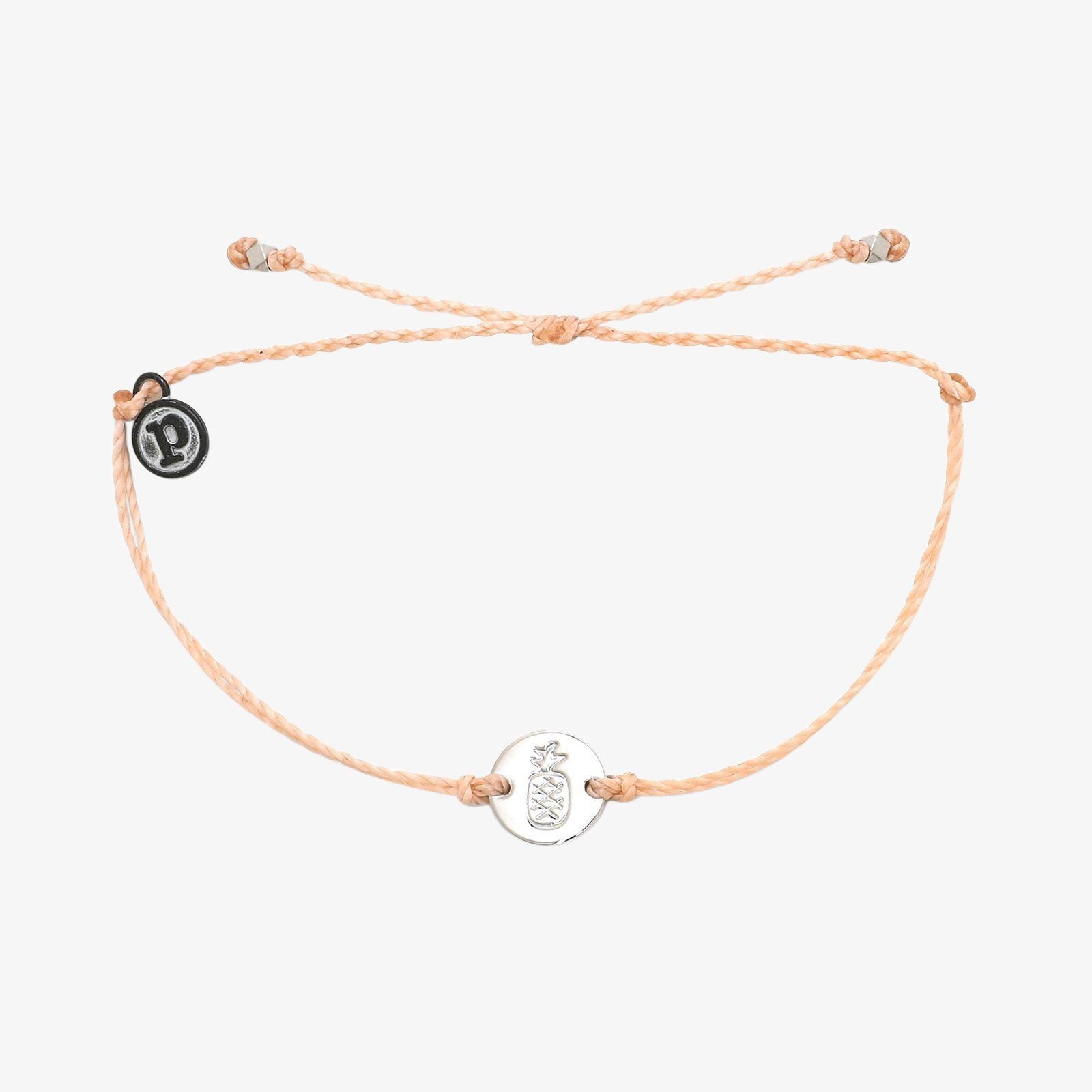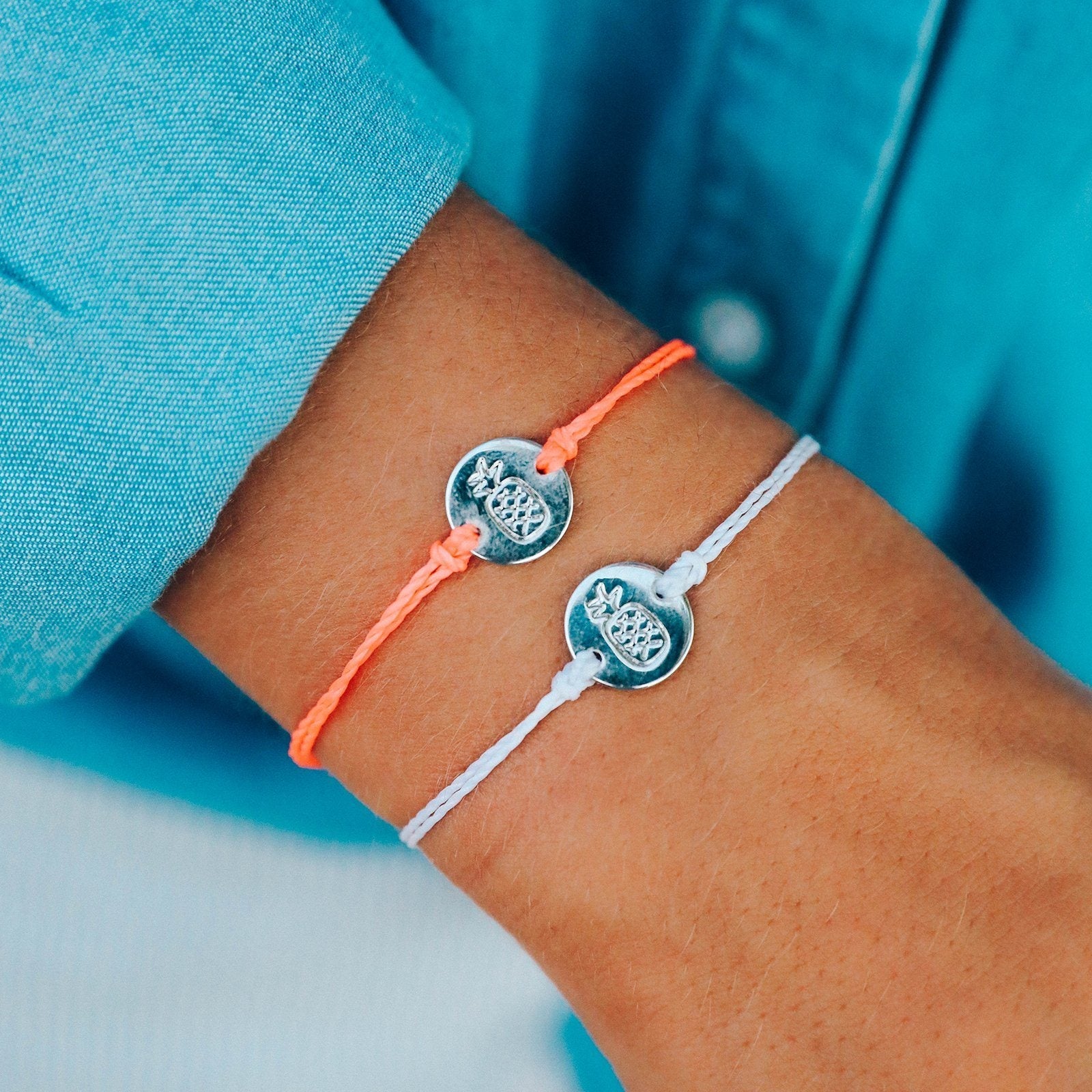 Who knew fruit could be so cute?! Our Pineapple Coin Bracelet is designed with a simple string band and double-sided silver charm. Wear it one way for a pretty pineapple etching, then flip it over for a Hawaiian “hello”!