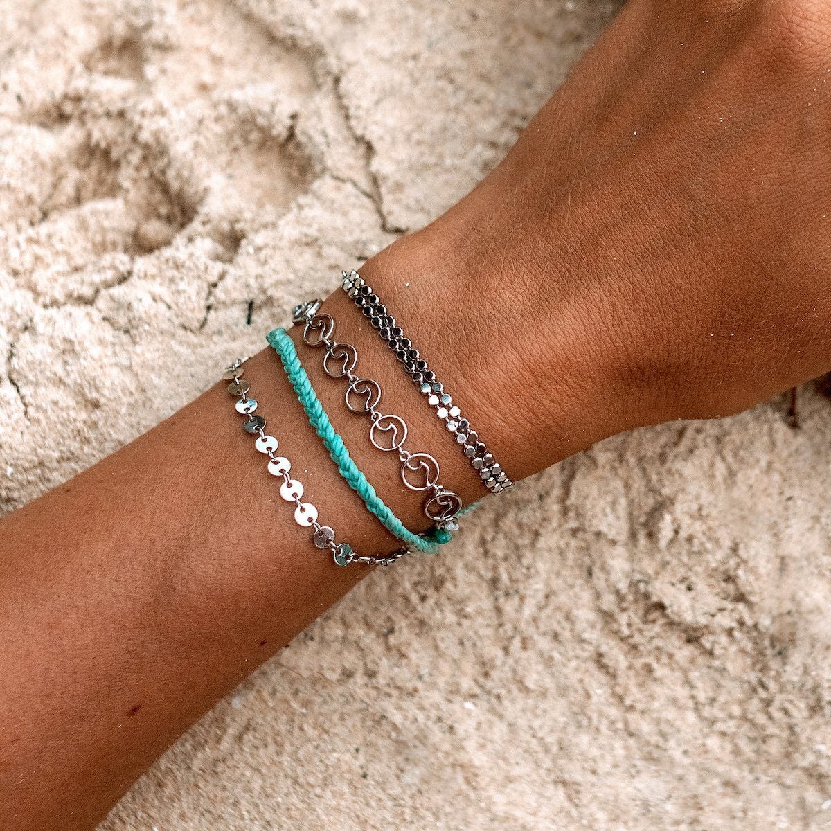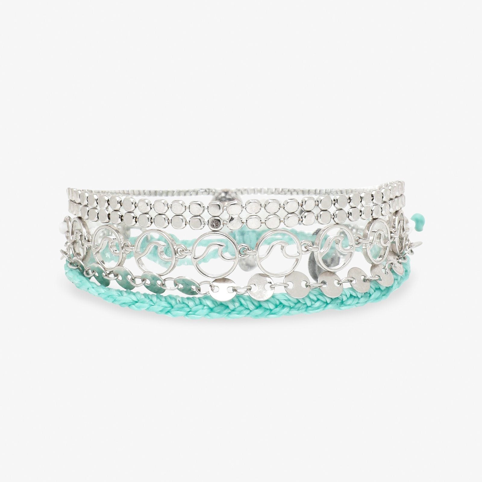 Listen to the waves with our Silver Swells Pack! In seafoam and silver, this pack includes a double flat coin chain slider bracelet, a mini waves chain bracelet and a flat coin chain bitty braided bracelet! Your source of a little vitamin sea!