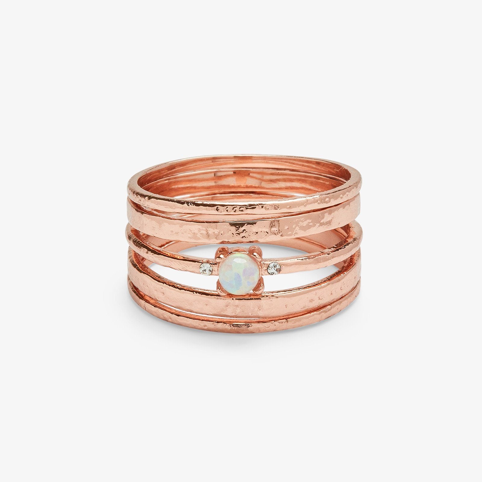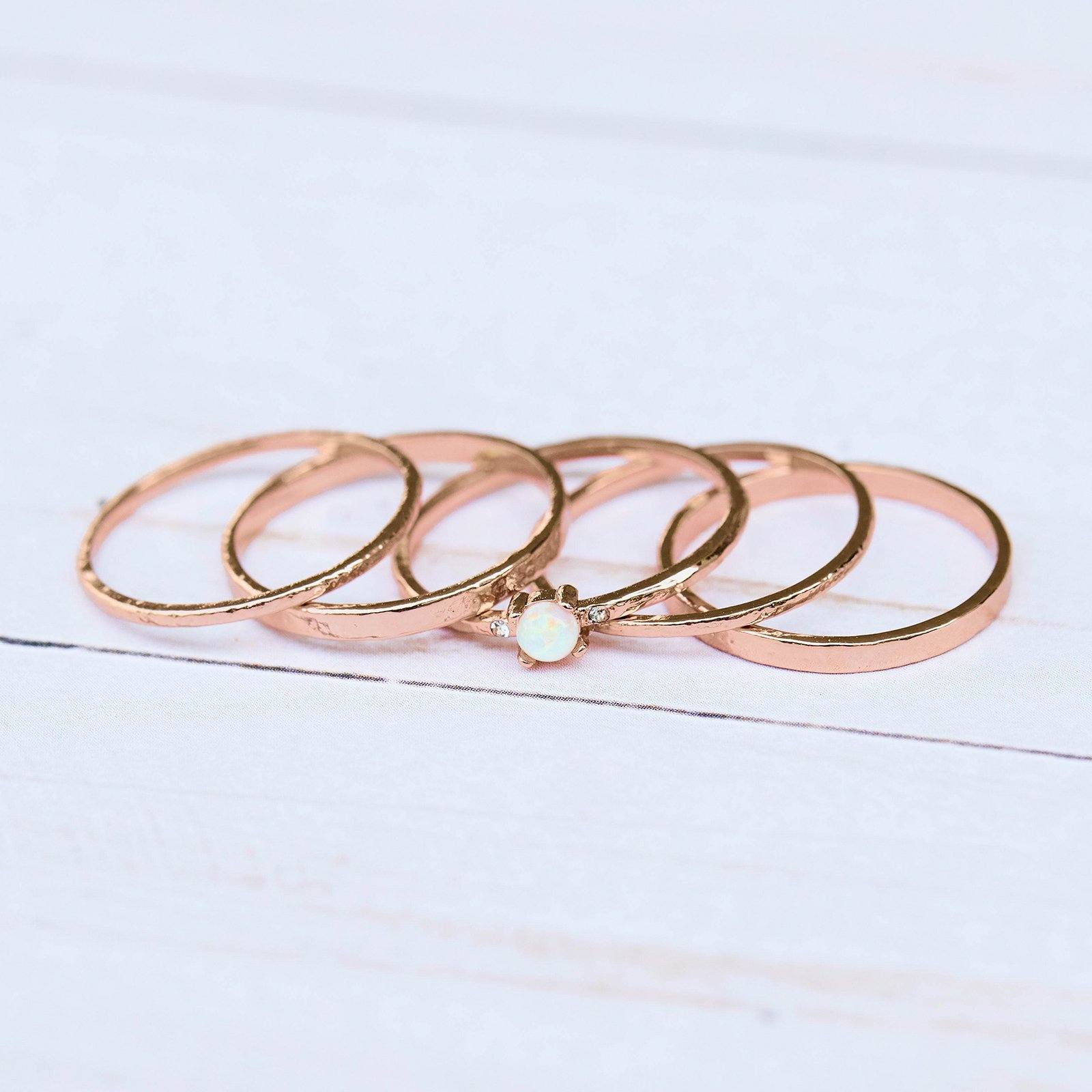 We made stacking super simple, thanks to our Solana Ring Stack. This blushing rose gold set features five femme styles—two thick bands, two thin bands, and a stunning opalite stone.