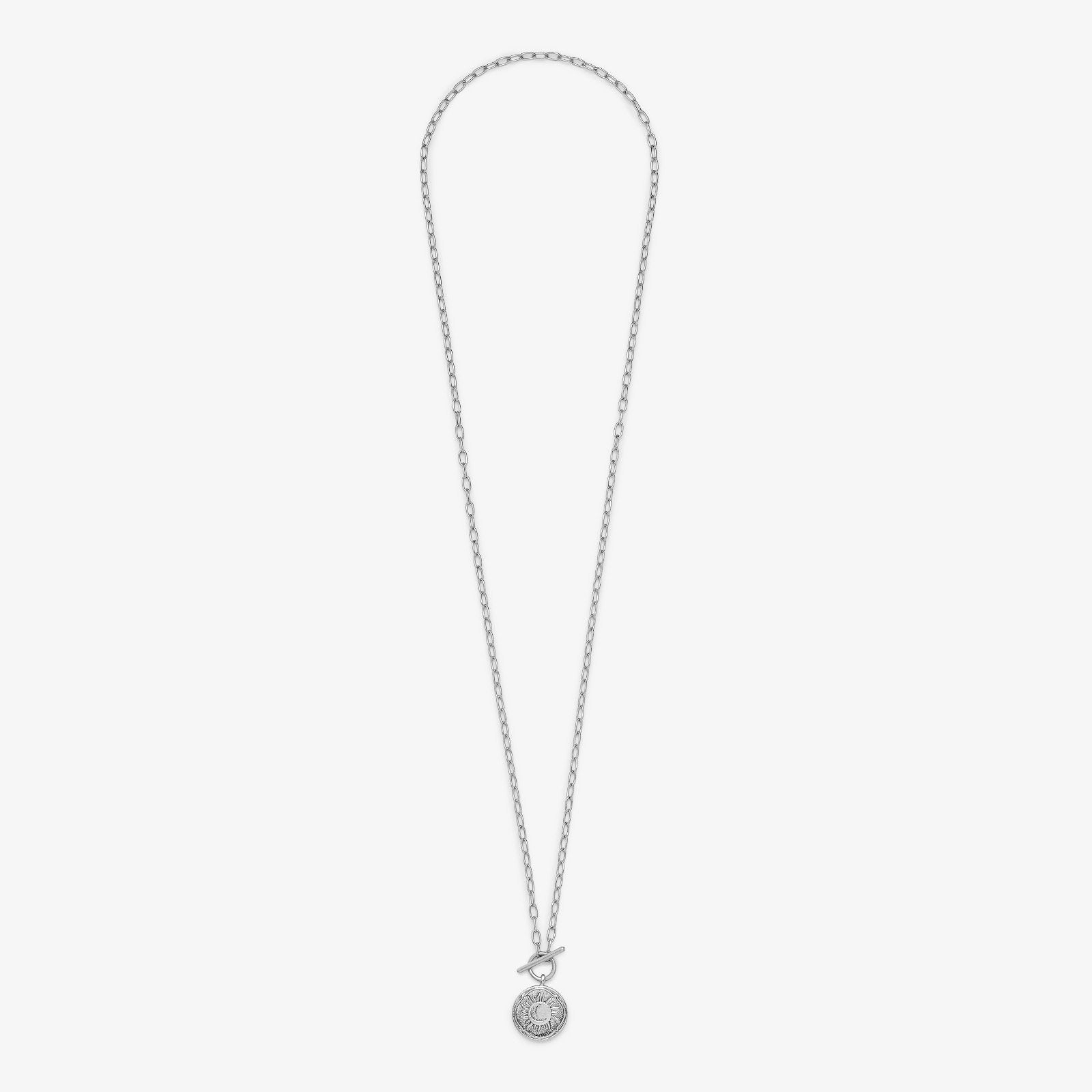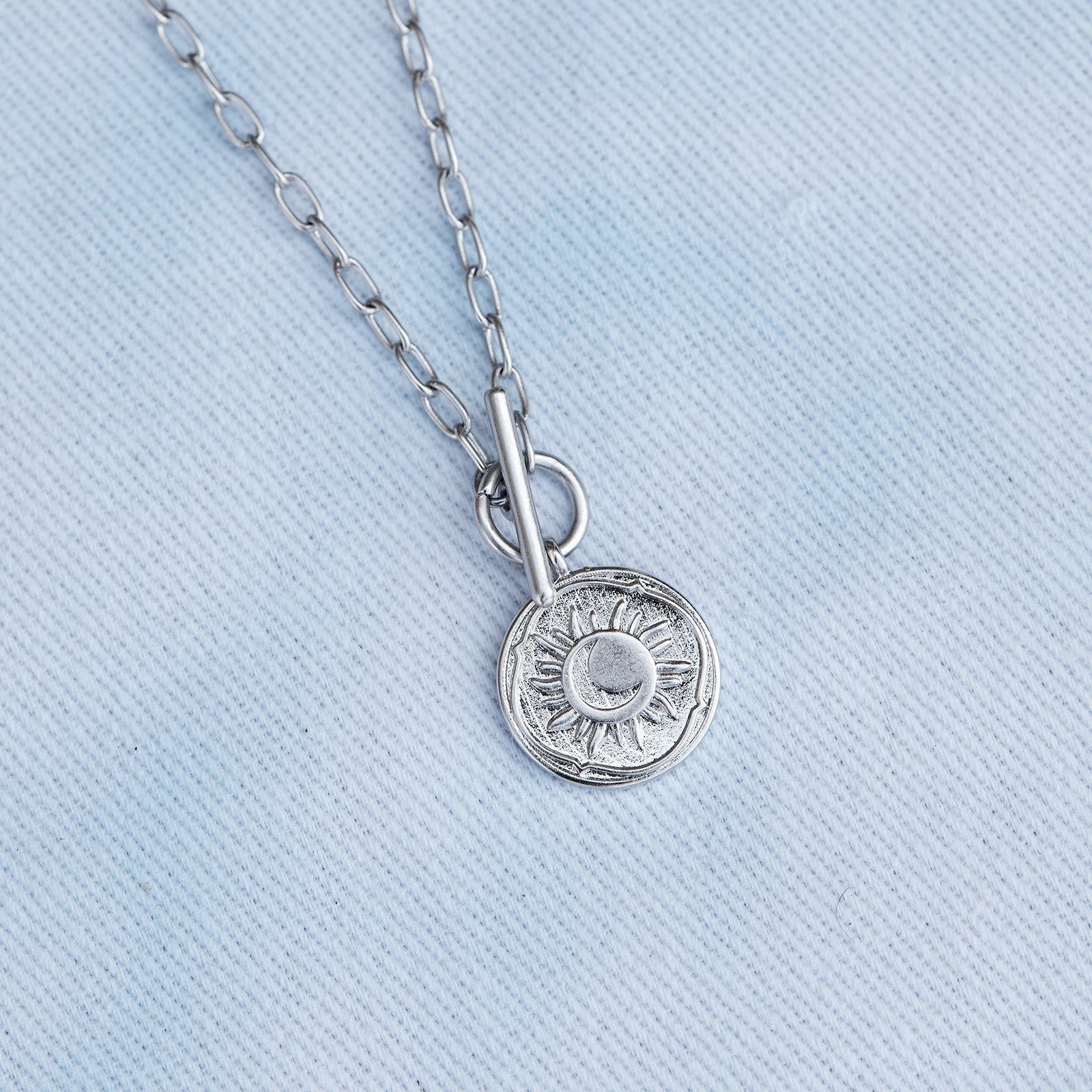 Our Sun & Moon Toggle Necklace always looks amazing—no matter the time of day. With a silver paper-link chain and toggle opening, this celestial style features a simple coin charm embossed with a sun and moon graphic for a totally lunar look.