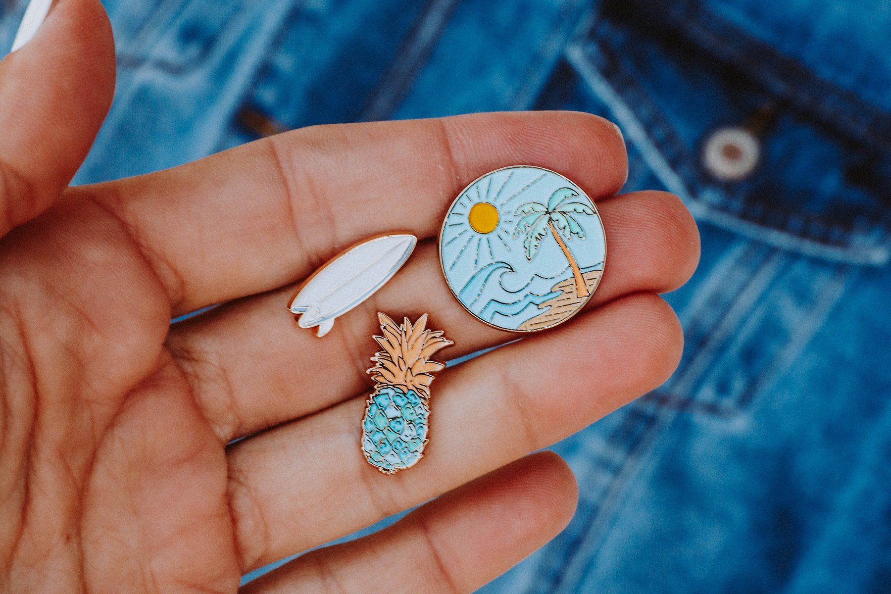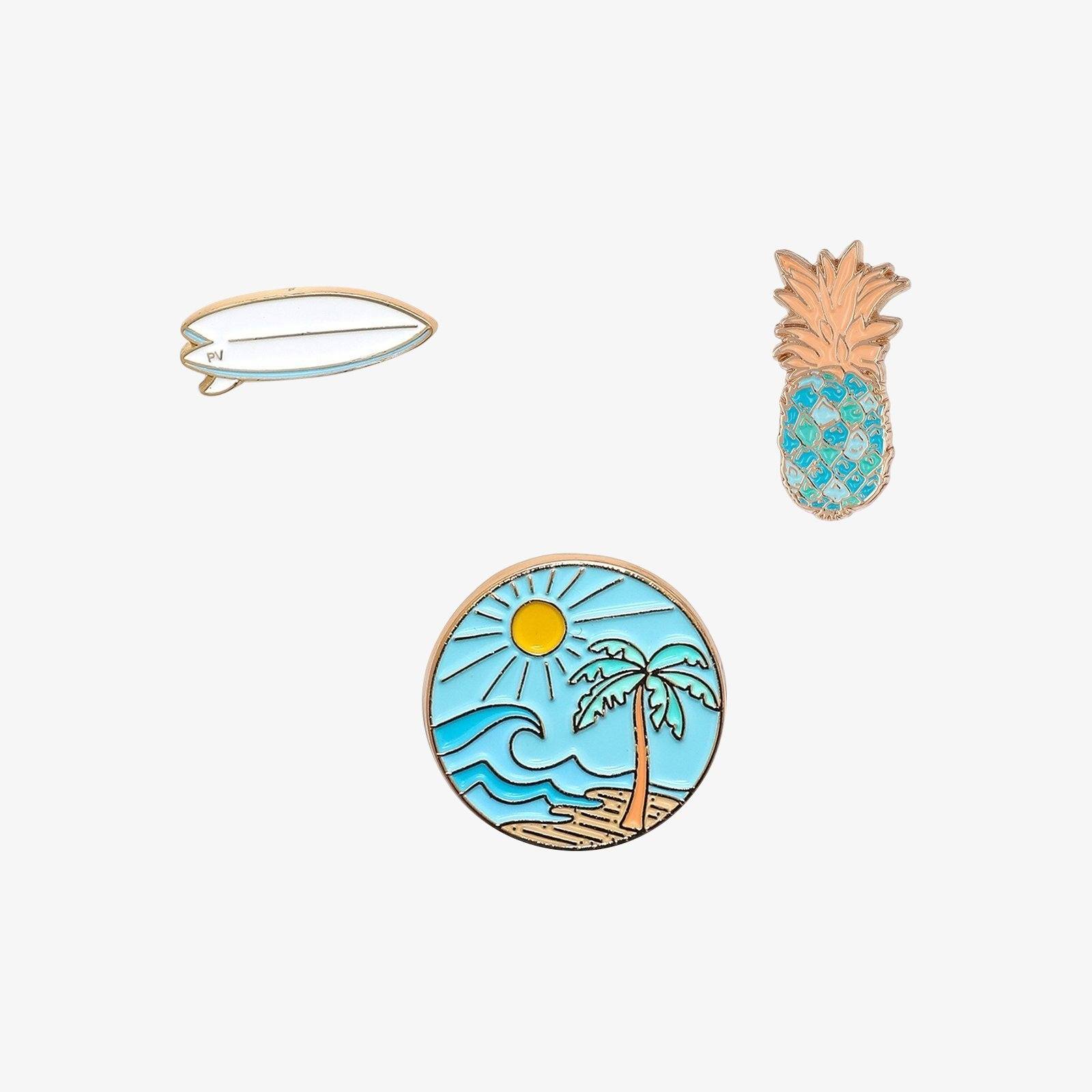 Show off your killer surf style everywhere you go with this gnarly trio of pins. The set includes a surfboard, pineapple and beach scene pin, and gives off a care-free, adventure-loving vibe that’ll totally make waves.