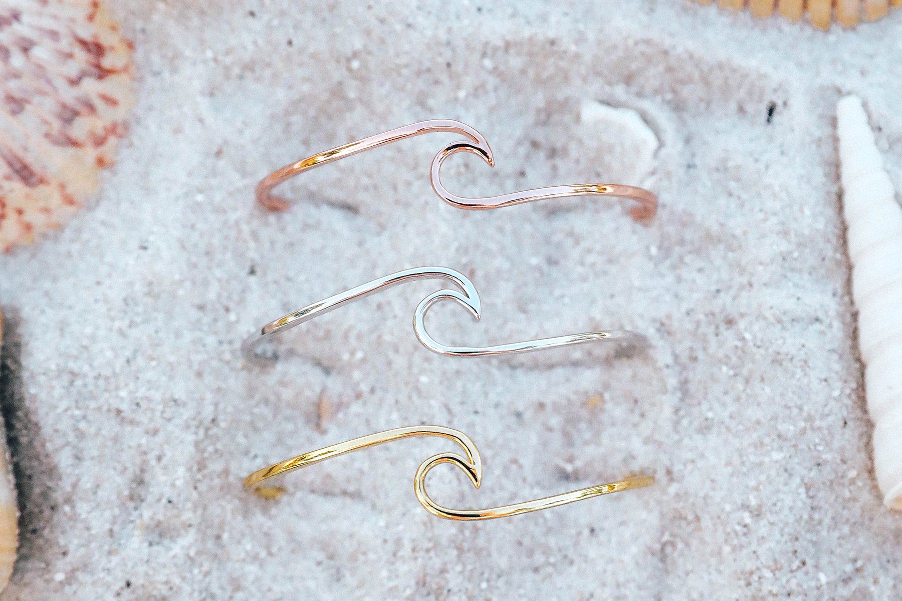 Our best-selling Wave style is back in bracelet form! These cuffs are plated to perfection so they catch the light from every angle. Get ready to bring those beachy vibes all. year. long. Available in both gold, silver, and rose gold, these special edition cuffs are bound to go quick!