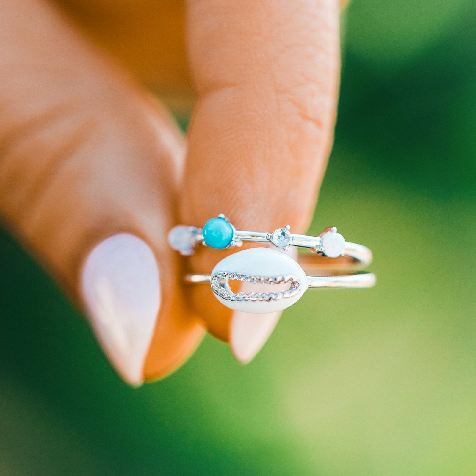 Stacking made easy with the beachy Zuma Ring Pack! This stack features a cowrie shell ring and multi gemstone ring set with sparkling glass, turquoise and moonstone stones.